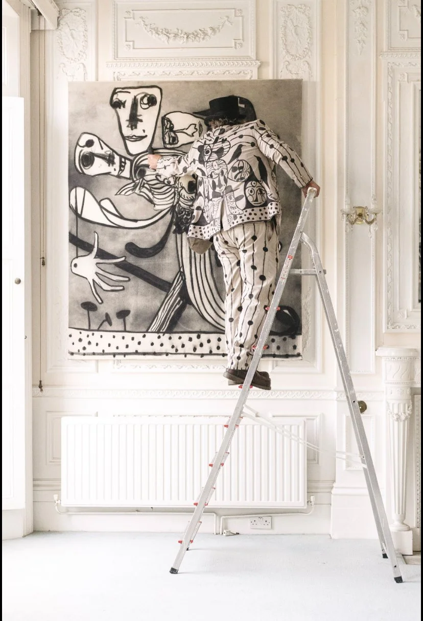 Installed through some of the more unusual spaces across the ground floor of The Sherborne, the exhibition carries a darker, stranger and more theatrical current into Of Myths and Murals. If Sir Quentin Blake’s The Joy of the Frog rises with buoyancy, humour and comic lift, The Baron’s paintings occupy a more unstable territory: one of distortion, psychic pressure and metamorphosis as something bodily, awkward and alive.